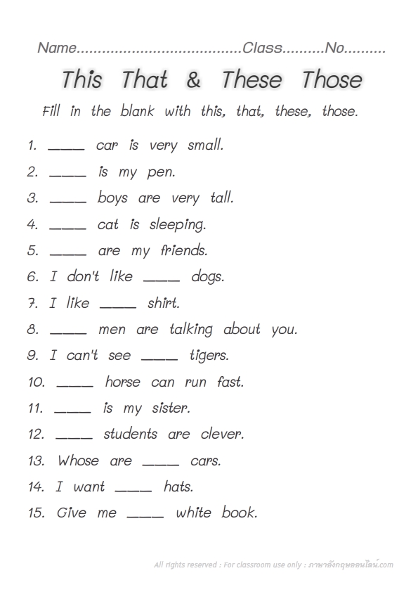 ใบงาน This, That & These, Those ใบงานภาษาอังกฤษไวฝึกฝนไวยากรณ์ เรื่อง หลักการใช้ This, That & These, Those ดาวน์โหลดใบงาน This, That & These, Those คลิก ศึกษาหลักการใช้ This, That & These, Those คลิก